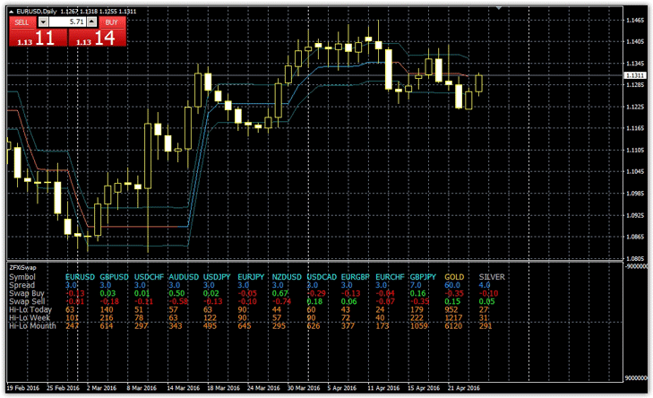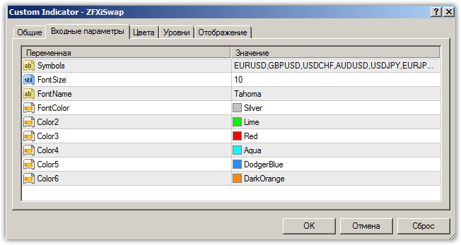 Самым основным индикатором, который отображает своп по разным валютным парам для покупок и продаж является индикатор ZFXiSwap. По умолчанию ZFXiSwap отображает информацию по 11 валютным парам и 2 металлам. В настройках индикатора можно изменять валютные пары, убирая те у которых своп как для покупок так и для продаж очень маленький или отрицательный. Для этого в строке Symbols пропишите большими буквами необходимые валютные пары через запятую.