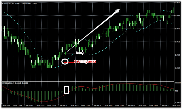 Самое интересное, что даже в справочнике или на официальном сайте разработчиков, где лежат подробные инструкции по программе, нет никаких описаний и намеков на варианты применения этих полезных дополнений. Собственно стандартный шаблон Layers также окутан какой-то мистикой и отсутствием информации, поэтому мы решили прервать этот замкнутый круг незнания и непонимания как применять стандартные шаблоны, в том числе и Layers. Шаблон Layers - это удачный подбор самых распространенных и часто применяемых индикаторов. Мало кто знает, но шаблон Layers соединил в себе четыре торговые стратегии, которые с переключением периода графика автоматически меняются, причем условно их можно разделить на долгосрочные, среднесрочные, краткосрочные в виду их появления на малом среднем и длительном тайм фрейме. Стоит добавить, что две из этих стратегий являются трендовыми по своей сути, третья долгосрочная канальная, а четвертая скальпирующая. Собственно в этой статье мы кратко пробежим по каждой стратегии. Установка шаблона. Подготовка к работе по стратегиям Собственно шаблон Layers не требует установки, поскольку разработчики его внедрили по умолчанию. Чтобы произвести запуск войдите в дополнительное меню правой кнопкой мыши и найдите строку «Шаблон». После того как вы переведете курсор на «Шаблон» у вас появится список, где необходимо выбрать Layers. Как мы уже упоминали, при смене тайм фрейма кардинально меняются стратегии, поэтому мы будем делать описание шаблона по разным стратегиям. Шаблон Layers на М1 При включении минутного графика шаблон Layers предлагает нам воспользоваться простой и в тоже время интересной скальпинговой стратегией. Она состоит из двух простых индикаторов, а именно MACD и Parabolic Sar. Все настройки применяются по умолчанию, причем стоит отметить что Parabolic Sar отвечает за направление тренда и фильтр позиции, а MACD за точку входа в рынок. Итак давайте по сигналам. Сигнал на покупку для шаблона Layers на М1: 1) Гистограмма MACD пересекла нулевую черту вверх. Открываем позицию по закрытой свече, а стоп приказ устанавливаем на уровне точки Parabolic Sar в момент входа в рынок.