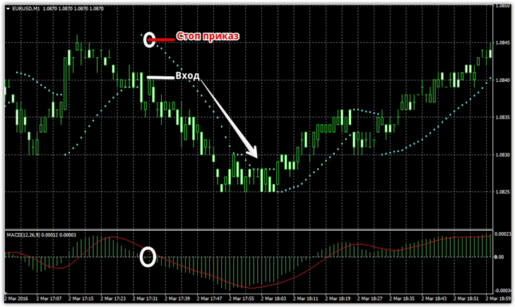 Сигнал на продажу для шаблона Layers на М1: 1) Гистограмма MACD пересекла нулевую черту вниз. Открываем позицию по закрытой свече, а стоп приказ устанавливаем на уровне точки Parabolic Sar в момент входа в рынок.