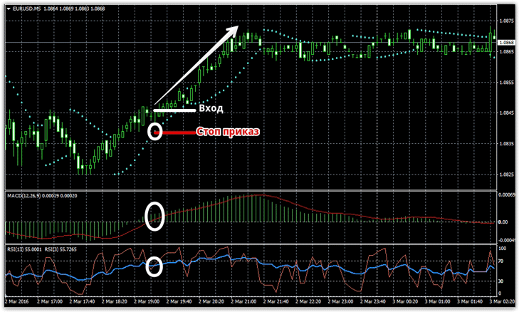 Шаблон Layers на М5 Шаблон Layers на М5 также сосредоточен на скальпировании рынка, единственное, что изменяется в этой стратегии, так это добавление индикатора RSI и кардинальное изменение применение MACD с сигнального индикатора на определитель тренда. Сигнал на покупку для шаблона Layers на М5: 1) Красная линия RSI пересекает голубую линию RSI снизу вверх. Открываем позицию по закрытой свече, а стоп приказ устанавливаем на уровне точки Parabolic Sar в момент входа в рынок.