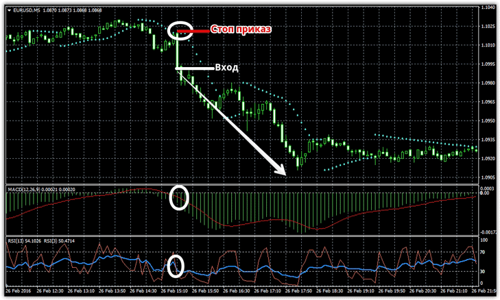 Сигнал на продажу для шаблона Layers на М5: 1) Красная линия RSI пересекает голубую линию RSI сверху вниз. Открываем позицию по закрытой свече, а стоп приказ устанавливаем на уровне точки Parabolic Sar в момент входа в рынок.