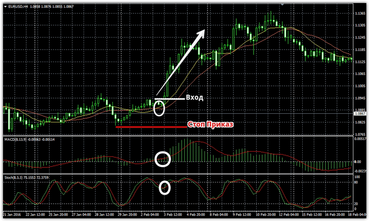 Шаблон Layers на Н1 и Н4 На часовом и четырехчасовом графике шаблон Layers кардинально меняет стратегию со скальпинга на трендовую тактику. Вместо RSI появляется стохастический осциллятор, а вместо Parabolic Sar две скользящие средние. Сигнал на покупку для шаблона Layers на Н1 и Н4: 1) Скользящая средняя с периодом 13 пересекаю скользящую среднюю с периодом 21 снизу вверх. Открываем позицию по закрытой свече, а стоп приказ устанавливаем на локальном минимуме.