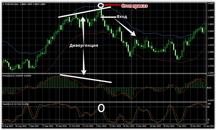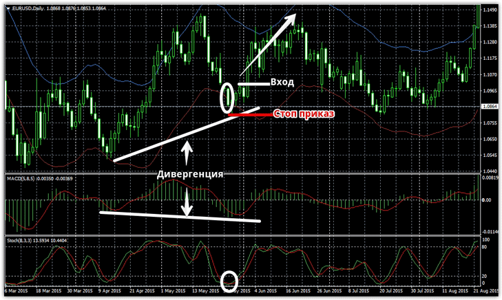 Шаблон Layers на D1 При смене тайм фрейма на дневной происходит кардинальное и радикальное изменение торговой стратегии с трендовой на канальную, где торговля происходит на отбой от границ канала. В отличие от трендовой стратегии, описанной выше на D1, вместо скользящих появляется канал Envelope, а MACD используется для поиска дивергенций. Сигнал на покупку для шаблона Layers на D1: 1) Цена находится у нижней границы канала Envelope. Стоп приказ ставим на локальном минимуме: