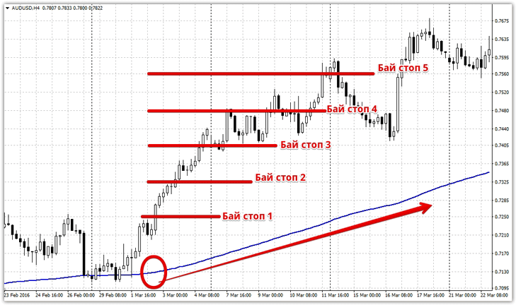 Первый вариант шаблона, который мы хотим с вами рассмотреть это использование сетки ордеров наряду с трендовым индикатором. Итак, для чего же нам скользящая средняя с периодом 200? Как мы уже говорили, с такого рода стратегиями выстраивается только один тип отложенных ордеров или бай селл и сли селл стоп. Скользящая средняя с таким большим периодом позволяет нам выстроить сеть отложенных ордеров только в сторону тренда. Дабы увеличить прибыльность и при этом уменьшить риски при открытии последующих ордеров необходимо выстраивать ордера статическим лотом. Итак, давайте непосредственно к правилам: Сеть на повышение для покупок: 1) Цена находится над скользящей средней, что говорит о сильном восходящем тренде. 2) Интерпретировав тренд, выставляем 5-10 отложенных ордеров бай стоп с одинаковым отступом между друг другом. Профит – размер между отложенными ордерами, стоп также равен расстоянию между отложками. Если сработал ордер и закрылся по профиту или стоп приказу необходимо достраивать сеть открывая новые отложенные ордера.