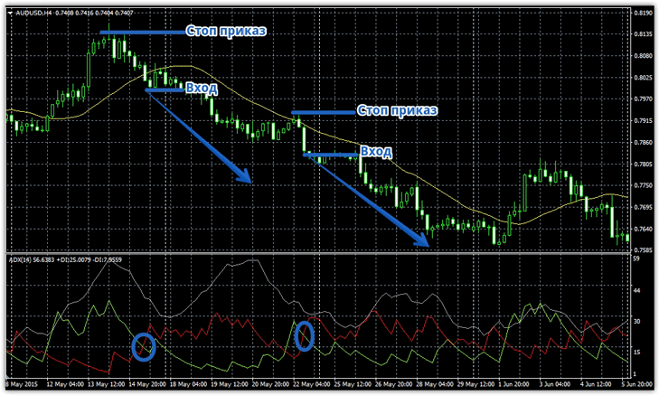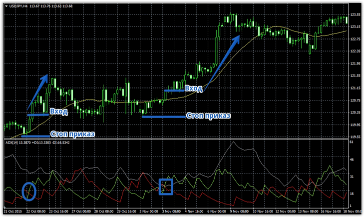 Сердце шаблона ADX. Хитрости и функциональные возможности элементов шаблона Посмотрев на название шаблона индикатора можно с легкостью определить, что именно ADX является главным источником сигнала, а Moving Average обыкновенным фильтром. Прежде чем приступить к самой торговой стратегии давайте проведем обзор этих индикаторов и разберемся какие сигналы они могут нам давать помимо торговой стратегии. ADX – это уникальная разработка Уэллса Уайлдера, благодаря которой можно легко определить наличие тенденции на выбранном вами инструменте и получить торговые сигналы в его ее направлении. Индикатор состоит из трех линий, а именно ADX, +DI, -DI. Линия ADX, на картинке синим цветом отображает силу текущего тренда. Так, например если вы видите, что эта линия выше двух остальных и стремительно набирает рост – на рынке сформировалось сильное трендовое движение. Если линия находится в экстремальных верхних точках, то вход в позицию довольно опасен, поскольку сила тренда на исходе и возможно в этот момент формируются ордера, которые переломят ситуацию на рынке. Однако сигнально образующими линиями являются +DI, -DI которые своим пересечением отображают смену тенденции на рынке. В случае если +DI выше –DI на рынке сформировалась бычья тенденция, а если –DI выше +DI на рынке отчетливая медвежья тенденция. Индикатор Moving Average – самый распространенный трендовый индикатор, который способен отображать как текущее направление тренда, так и давать сигналы в рынок при пересечении линии ценой снизу вверх или наоборот. Входим в рынок Шаблон ADX, как и любая торговая стратегия имеет свои правила для входа в рынок, которые должны четко соблюдаться. Сигнал на покупку: 1) Цена пересекла скользящую среднюю снизу вверх или находится над нею. Немаловажным является грамотный подход к рискам, поэтому стоп приказ необходимо установить возле локального минимума. Пример на картинке ниже: