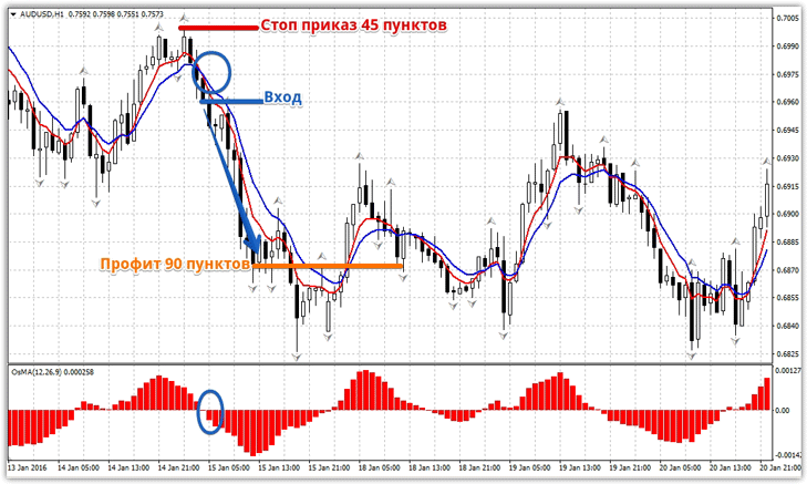 Вариант применения шаблона используя мартингейл с малым капиталом Многие ошибочно полагают, что мартингейл можно применять если вы обладатель огромного капитала в десятки, а то и в сотни тысяч долларов. Конечно, в основном работая по данной стратегии, практически никогда не выставляются стоп приказы, а позиции наращиваются против движения цены. Однако если вы не обладаете огромным депозитом вы можете применять мартингейл используя фиксированный стоп лосс, но при этом удваивать каждую новую позицию в случае убытка предыдущей. Собственно давайте подробно разберем на нашем шаблоне правила работы. Сигнал на покупку: 1) Скользящая средняя с периодом 5(красная) пересекла скользящую среднюю с периодом 9 (синяя) снизу вверх. Очень важно установить стоп приказ, который находится на уровне стрелочки указывающей вниз индикатора Fractal. Также немаловажно заранее выставить наш тейк профит, который должен быть в два раза выше нашего стоп приказа. Так если стоп приказ составил 10 пунктов, то профит должен быть 20 но ни в коем случае не меньше, поскольку в противном случае мартингейл будет убыточным для вашей стратегии.