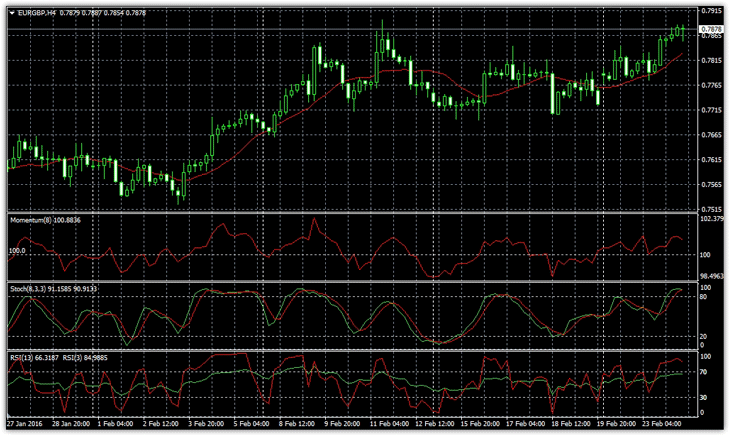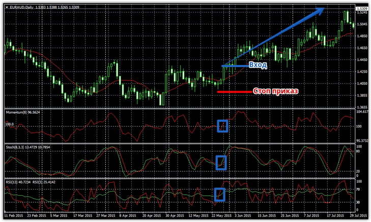 Разбор по элементам Чтобы понять все плюсы и минусы этой стратегии необходимо более детально разобрать каждый из элементов шаблона, что даст полную картину о дублирующих функциях индикаторов и поможет выявить недостающих элементов. Индикатор Moving Average с периодом 13. В шаблоне Momentum скользящая средняя выступает в роли сигнализатора смены тенденции. Возможные сигналы на покупки или продажу рассматриваются только после пробоя ценой линии индикатора, а в случае добавления по тренду к уже существующей позиции рассматривается местоположение цены относительно скользящей средней. В стратегии этот индикатор выполняет сигнальную функцию, причем сам инструмент применяется не в классическом виде по типу дивергенций или впадин на сильном росте, а в качестве осциллятора, который сигнализирует о смене тенденции, пробивая свою сигнальную линию на уровне 100. Stochastic Oscillator. В шаблоне Momentum выполняет роль предварительного сигнала к входу в позицию, причем не важно в зоне перекупленности находится индикатор или перепроданности, важно лишь пересечение его сигнальных линий. Стоит заметить, что пересечение линий в зонах упомянутых выше усиливает сигнал индикатора. RSI как и со Stochastic Oscillator применяется не по прямому назначению индикатора, а берется во внимание лишь пересечение двух линий индикатора, но с разным периодом. Сигналы шаблона MomentumИсходной точкой, из которой происходит рассмотрение сигнала, является пробой ценой скользящей средней. Итак, сигнал на покупку: 1) Цена пробила скользящую среднюю с периодом 13 снизу вверх и закрылась над ней. 2) Momentum пробил уровень 100 снизу вверх. 3) Зеленая линия Stochastic Oscillator пробила красную снизу вверх. 4) Красная линия RSI пересекла зеленую снизу вверх. Входим только по закрытому бару. Обязательно дожидаемся соблюдение всех условий, а защитный ордер устанавливаем у локального минимума.