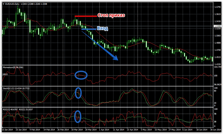 Исходной точкой, из которой происходит рассмотрение сигнала, является пробой ценой скользящей средней. Итак, сигнал на продажу: 1) Цена пробила скользящую среднюю с периодом 13 сверху вниз и закрылась под ней. 2) Momentum пробил уровень 100 сверху вниз. 3) Зеленая линия Stochastic Oscillator пробила красную сверху вниз. 4) Красная линия RSI пересекла зеленую сверху вниз. Входим только по закрытому бару. Обязательно дожидаемся соблюдение всех условий, а защитный ордер устанавливаем у локального максимума.