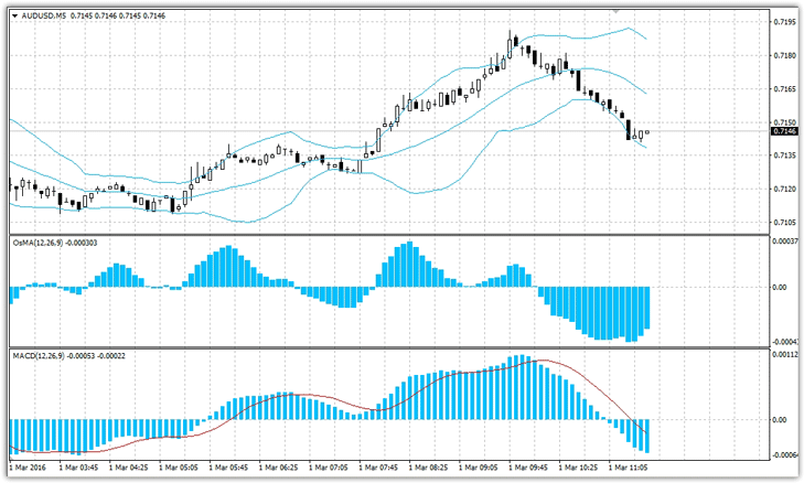 Шаблон скальпингВ основе практически любой скальпинг стратегии лежат технические индикаторы, которые используют прямо по их назначению. К сожалению, Как вы понимаете если для трендовой стратегии войти на 20 пунктов позже при целях 100 и более пунктов это считается нормой, то для скальпинга где цели составляют 10-20 пунктов это просто убийственно для вашего депозита. Именно поэтому всем привычные скальпинг стратегии получают негативные отзывы от трейдеров. Чтобы создать действительно стоящую скальпинг стратегию необходимо подходить не прямолинейно, а смотреть на предсказывающие возможности тех или иных осцилляторов. Собственно для того чтобы продемонстрировать совсем иной подход к скальпингу предлагаем вам протестировать наш шаблон с индикаторами для скальпига, который основывается на самом популярном предсказывающем разворотном сигнале дивергенция. Подготовка скальпинг шаблона к работе Базовой основой скальпинг шаблона лежат два осциллятора MACD и OsMA которые способны показывать дивергенции предзнаменующие разворот. Отчетные точки для входа предоставляет индикатор полос Боллинджера. Собственно все элементы шаблона используют настройки по умолчанию, поэтому вы можете нанести все три индикатора на график самостоятельно. Также вы можете скачать готовый шаблон скальпинг, который устанавливается путем скидывания файла шаблона в папку Template через каталог данных вашего терминала. Если вы установили шаблон, сделанный нами, то после его запуска вы увидите такую рабочую область графика: