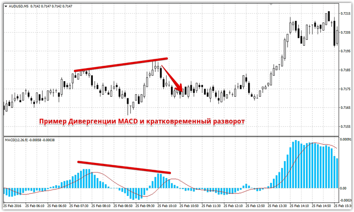 Описание элементов скальпинг шаблона. Потенциал дивергенций Дивергенция – это крайне редкий встречающийся сигнал, в основе которого лежит расхождение показаний индикатора с реальной рыночной ситуацией. Уникальность такого явления состоит в том, что сам паттерн предсказывает будущий разворот цены, причем неважно это откат или глобальный разворот, поскольку скальпинг определяет малые цели с многократным входом в рынок. В этом шаблоне сосредоточенно два индикатора, которые дают нам сигналы дивергенций, а именно MACD и OsMA. Итак давайте проведем описание элементов шаблона и посмотрим графически в чем заключается их дивергенция. 1) MACD – осциллятор, который в подавляющих случаях используется как фильтр тренда по месту расположения гистограммы относительно сигнальной линии. В этом шаблоне несет исключительно сигнальную функцию, применяя его особенность к дивергенциям. Дивергенция на индикаторе MACD отображается в виде несоответствия пиков цены с пиками гистограммы. Для примера цена обновила новый максимум и сформировала новый локальный максимум, а гистограмм МАСD в этот момент показывает что этот пик ниже предыдущего. Для примера смотрим ниже: