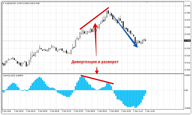 2) OsMA – индикатор осциллятор, который по всем своим свойствам и характеристикам также напоминает MACD. Большинство трейдеров применяет его для входа в позицию при пересечении гистограммой его сигнальной линии а также для фильтра тренда. Однако как и MACD этот индикатор способен предсказывать развороты цены с помощью сигналов дивергенций. Как и в случае с MACD дивергенция для этого индикатора появляется в случае обрисовки гистограммой минимума или максимума, который на самом деле больше или меньше чем реальная рыночная ситуация. Пример ниже: