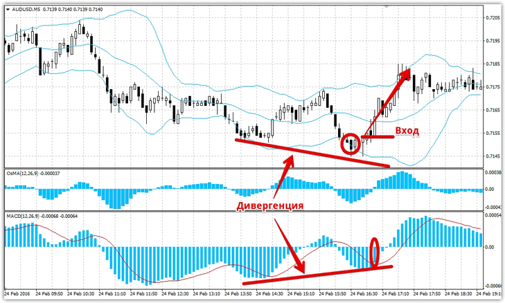 3) Полосы Боллинджера – это самый популярный индикатор скальперов, который строит границы канала, а вся торговля ведется на отбой от этих границ. Этот индикатор по своей сути является скальперским, а дополнительные сигналы в виде дивергенций у его границ только усиливают разворотные сигналы. Сигналы шаблона скальпинг Как и любая скальперская стратегия предложенный шаблон может применяться на любом активе минутного или пятиминутного графика. Итак непосредственно к сигналам. Сигналы на покупку: 1) Цена находится у нижней границы полосы Боллинджера. 2) MACD или OsMA формируют дивергенцию под сигнальной линией. Очень важно дождаться закрытия свечи и первого появившегося столбика на снижения пика гистограммы индикаторов MACD или OsMA. Пример на картинке ниже: