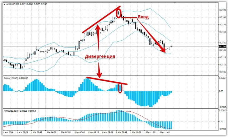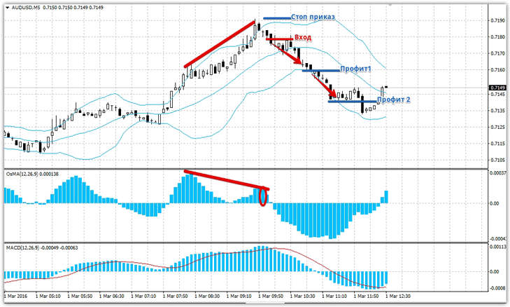 Сигналы на продажу: 1) Цена находится у верхней границы полосы Боллинджера. Очень важно дождаться закрытия свечи и первого появившегося столбика на снижения пика гистограммы индикаторов MACD или OsMA. Пример на картинке ниже: