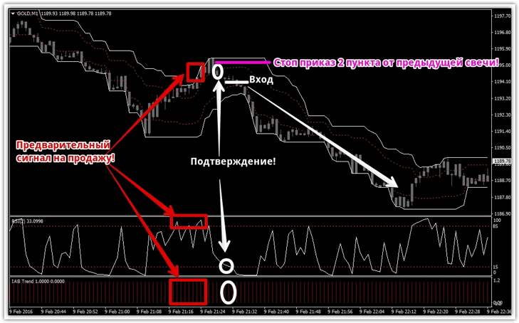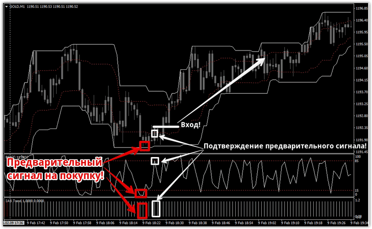 Требования к рынку. Тонкости Предложенный нами шаблон скальпинг стратегии применяется только на минутных и пятиминутных графиках. Стоит отметить, что стратегия, которая лежит в его основе показывает лучшие результаты на боковых рынках, поэтому такие валютные пары как GBP/USD, EUR/NZD, GBP/JPY, EUR/JPY, GOLD дают самые высокие показатели при торговле. В основе данного шаблона лежит всего три индикатора, а именно RSI, IAB Channel, IAB Trend. Последние два индикатора являются пользовательские и относительно новой разработкой, поэтому их автора полностью закрыли возможность к их настройкам. Правила стратегии. Точки входа в рынок В отличие от других подобных скальпинговых стратегий, которые в своей основе содержат канал, предусмотрено дополнительные фильтры, а также подтверждение сильного импульса индикатором RSI. В настройках RSI сильно занижен период, что необходимо для подтверждения сильного импульса. Правила для покупок: Предварительный сигнал 1) IAB Trend нарисовал белый столбик в самом нижнем дополнительном окне. Входим в позицию только по закрытой свече. Пример: