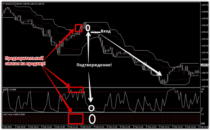 Правила для продаж: Предварительный сигнал 1) IAB Trend нарисовал красный столбик в самом нижнем дополнительном окне. Входим в позицию только по закрытой свече. Пример: