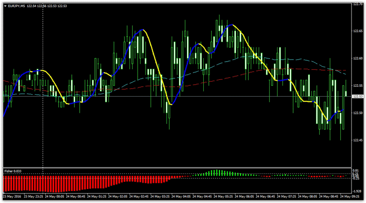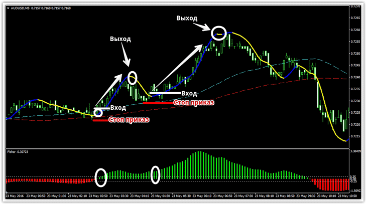 Индикаторы стратегии SuperScalper В стратегии SuperScalper применяется всего четыре индикатора, причем два из них это обычные стандартные скользящие средние, которые есть по умолчанию в каждом торговом терминале, а два остальных индикатора - это пользовательские инструменты. Стратегия SuperScalper выделяется тем, что в ней четко прописаны правила торговли в сторону тенденции, что редко встретишь в скальперских тактиках. Итак, давайте кратко познакомимся с инструментами стратегии: 1) Moving Average 50 и 100. В стратегии эти две скользящие являются главным ориентиром, в сторону которого будет вестись вся дальнейшая торговля. Так, если быстрая Moving Average 50 находится над медленной Moving Average 100 – рассматриваются только позиции на покупки. Если быстрая Moving Average 50 находится под медленной Moving Average 100 – рассматриваются только позиции на продажи. Собственно Moving Average это трендовый инструмент, который отлично справляется с функцией определения тенденции. 2) Superscalper. Этот индикатор является главным скальперским инструментом, на основе которого будет происходить вход в рынок. Superscalper отображает краткосрочный тренд, изменяя цвет с синего на желтый и наоборот. Смена цвета линии говорит о смене тенденции, на основе которой мы и будем входить в рынок. 3) Fisher Yur4ik. Данный инструмент является основным фильтром тренда и направления сделки. Так зеленые столбики гистограммы говорят о восходящем рынке, а красные – о нисходящем. Как правило, пересечение нулевой линии гистограммой говорит трейдеру о сильном изменении тренда, что может послужить рекомендацией к закрытию сделок и тд. Сигналы Любая тактика скальпирования и SuperScalper требует безукоризненного соблюдения правил. Также не стоит забывать о том, что при торговли очень важно ориентироваться на новостной фактор, а именно не торговать перед выходом сильных новостей. Итак, к сигнала. Сигнал для входа в позицию на покупку: 1) На рынке восходящая тенденция, которая подтверждается тем, что быстрая скользящая находится над медленной скользящей средней. 2) Индикатор Superscalper сменил цвет с желтого на синий. 3) Гистограмма Fisher Yur4ik зеленого цвета.