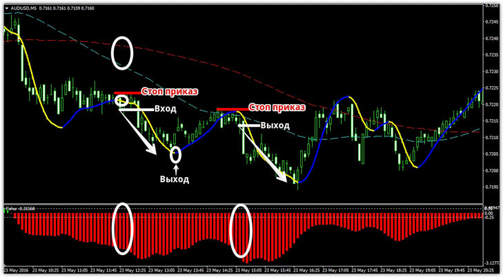 Сигнал для входа в позицию на продажу: 1) На рынке нисходящая тенденция, которая подтверждается тем, что быстрая скользящая находится под медленной скользящей средней. 2) Индикатор Superscalper сменил цвет с синего на желтый. 3) Гистограмма Fisher Yur4ik красного цвета.