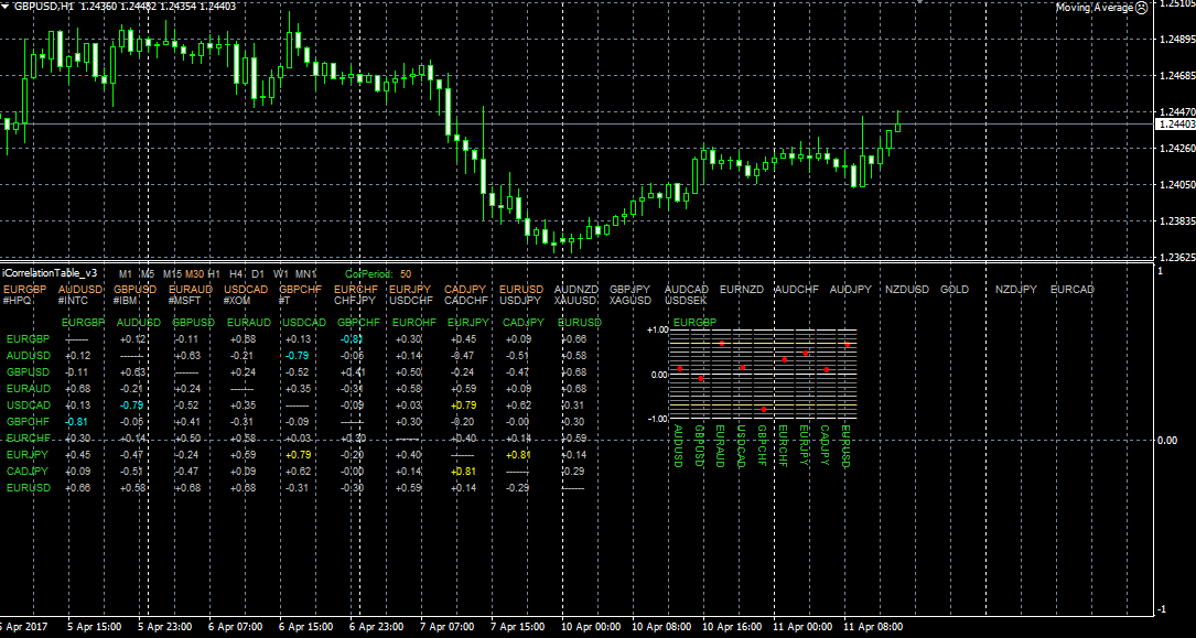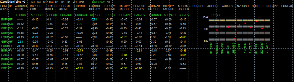 Коэффициент корреляции измеряется в пределах от -1 (обратная корреляция) до +1 (прямая корреляция). В самом верху индикатора размешены тайм фреймы, а также список валютных пар, которые представлены у вас в терминале в окне обзор рынка. Для того чтобы переключить таймфрейм либо добавить символ в таблицу необходимо два раза нажать на символ и сдвинуть с места. После появления нового тика на графике тайм фрейм будет переключен, а выбранная вами валютная пара добавлена в таблицу.