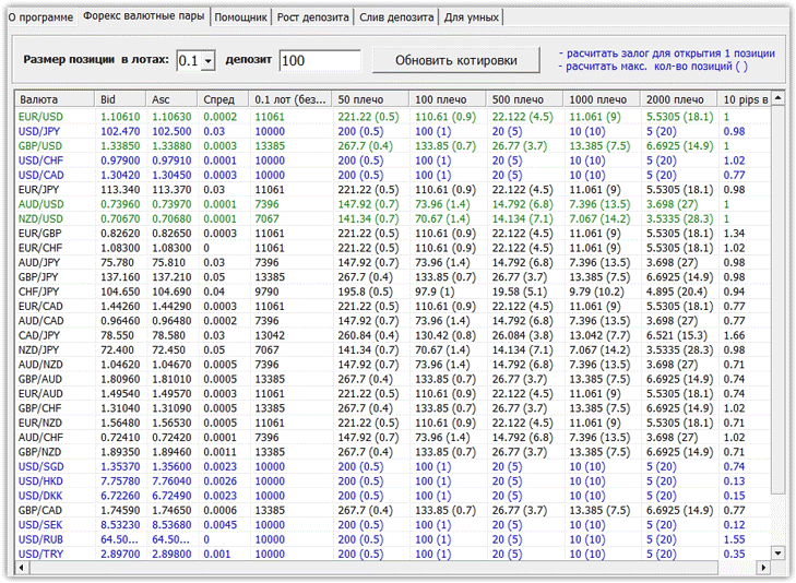 Функционал программы. Рабочие вкладки Автор данной программы в своем калькуляторе выделил отдельно пять рабочих вкладок, а именно: «Форекс валютные пары», «Помощник», «Рост депозита», «Слив депозита», «Для умных». В каждой из этих вкладок можно найти полезную информацию и выполнить определенные задачи, поэтому с каждой из них мы познакомимся, сделав обзор каждой из вкладок. Форекс валютные пары В данной вкладке вы можете увидеть таблицу со списком валютных пар. Над таблицой укажите размер вашего баланса а также размер лота, которым вы собираетесь вести торговлю и нажмите обновить. После обновления программа даст вам информацию о суме залога при открытии позиции указанным вами лотом при кредитном плече 1 к 50, 1 к 100, 1 к 500, 1 к 1000, 1к 2000. Также в данной таблице вы можете познакомиться со спрэдом и стоимостью 10 пунктов прохождения цены для каждой из валютных пар. Чтобы продолжить расчеты нажмите два раза на любую валютную пару, дабы автоматически перейти в следующую вкладку.