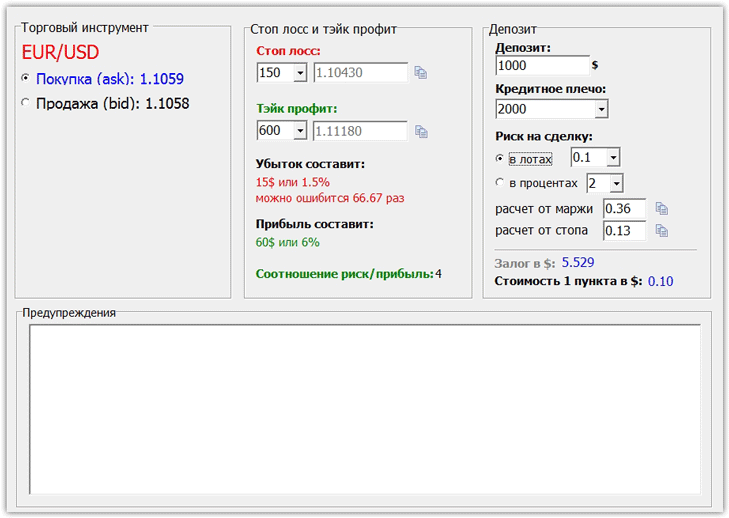 Данная вкладка служит для того чтобы рассчитать размер вашего лота в зависимости от процента риска от размера общего депозита или для того чтобы увидеть основную информацию по прибыли или убыткам если вы откроетесь определенным лотом. Так, для начала в строке депозит укажите реальный размер вашего депозита, а также размер кредитного плеча. После этого определитесь каким процентом от общего депозита вы готовы рискнуть. Чтобы получить полную информацию укажите размер стоп приказа и профита в пунктах, а программа в замен рассчитает для вас лот и отобразит какое количество, раз вы можете получить стоп приказы, чтобы слить ваш счет, а также размер прибыли и убытка в депозите и проценте. Помимо этого вы получите информацию по необходимому залогу и стоимости одного пункта.
