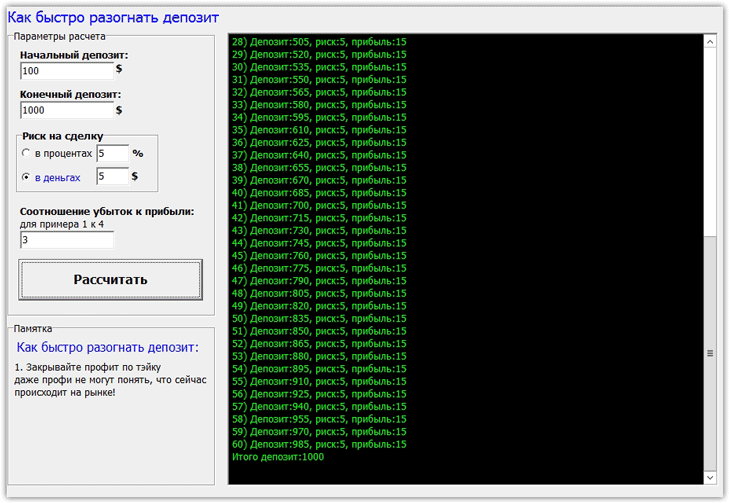 Данная вкладка позволяет наглядно увидеть как необходимо производить разгон депозита если вы задались определенной целью. Чтобы рассчитать необходимую лотность и увидеть наглядно какое количество сделок потребуется для достижение цели укажите в строке начальный депозит размер вашего депозита, а в строке конечный депозит укажите размер вашей цели. Далее вам понадобится указать соотношение убытка к прибыли по вашей стратегии. После того как вы ведете все необходимые данные нажмите «Рассчитать» и программа отобразит динамику развития счета.