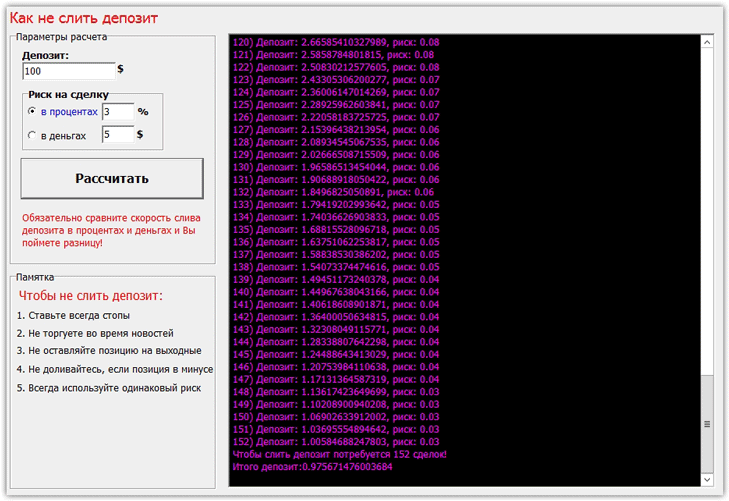 Данная вкладка позволяет наглядно увидеть поведение вашего капитала в зависимости от модели, которую вы выбрали при установке стоп приказа. Так, программа может рассчитать количество стоп приказов, которые может выдержать вас счет, если вы будете рисковать определенной сумой, а также определенным процентом от депозита. При сравнении двух моделей вы будете удивлены, когда уведете результативность процентного подхода и сможете выбрать для себя приемлемый вариант.