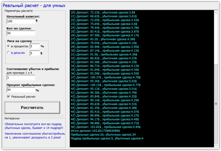 В данной вкладке можно увидеть поведение вашей стратегии, если вы знакомы с процентом прибыльных сделок по вашей стратегии. Для этого укажите соотношение убыточных сделок к прибыльной, а также общий процент прибыльных сделок. На основе данной информации программа сделает приблизительный расчет роста или уменьшения вашего депозита при определенном проценте риска.