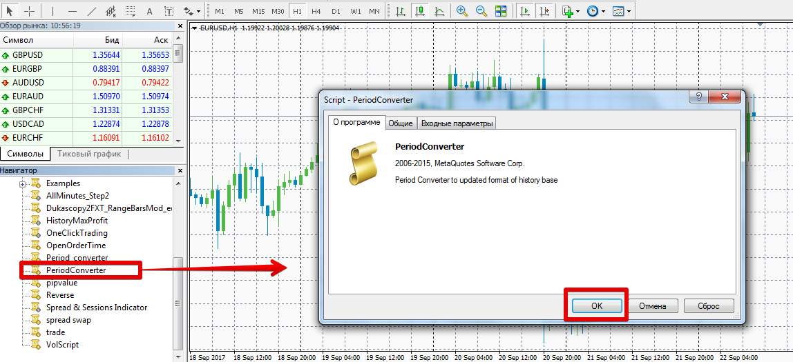 После обновления платформы в панели навигатор либо ее перезапуска Period Converter появится в списке скриптов, а для того чтобы начать его использовать перетащите название скрипта на тайм фрейм, который будет конвертироваться.
