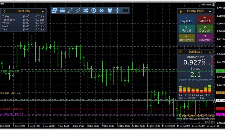 Одним из таких скриптов как раз и является «Trader Agent», задача которого – это облегчить труд трейдера при открытии и управлении позициями. Не смотря на то, что файл скрипта копируется в папку Experts, данная программа не является полноценным роботом, она только помогает в открытии сделок. Но в то же время Trader Agent обладает просто огромным функционалом, который позволяет произвести предварительную настройку открываемых ордеров, а затем легко изменить нужные параметры. После того как вы скачаете файл архива в конце статьи и распакуете, следует переместить TraderAgent.ex4 в папку Experts, а TraderAgent.dll в папку Libraries вашей торговой платформы metatrader 4. Затем перезапустить торговую платформу и установить инструмент на график: В результате на графике появятся информационные панели, которые при желании легко свернуть, чтобы они не мешали торговле. Что может Trader Agent?Довольно много, вот основные его функции: Функция безубыточности – позволяет перетянуть стоп ордера в зону безубыточности, тем самым зафиксировав прибыль. Управлять стоп лосс и тейк профит мышкой. Закрыть все ордера – одним кликом закрывает все открытые на этом счете позиции. Расчет объема с учетом риска – рассчитывает максимальный объем сделок с учетом установленного уровня риска. Установка трейлинг стоп – скрипт помогает устанавливать трейлинг стоп для открытых позиций. Полная информация об ордерах – максимально полная информация о всех открытых позициях и состоянию счета. Информационное окно – в котором отображается информация о размере спреда по текущему активу и текущую цену: Реверс позиции – при нажатии позволяет моментально закрыть существующую позицию и открыть новую в противоположном направлении. Открытие позиций при пробое – можно задать уровни, при достижении которых произойдет открытие нового ордера. Максимальное значение спреда – интересная функция позволяющая установить максимальный размер спреда, при котором будут открываться позиции. Это наиболее интересные возможности программы, которые могут повлиять на эффективность работы. При запуске советника не забудьте разрешить импорт DLL, в ином случае скрипт будет выдавать ошибку. Что касается настроек, то они максимально просты и интуитивны. Для скачивания доступна только пробная версия, которая полноценно будет работать в течение тестового периода, полноценный вариант стоит 99 долларов и купить его можно на сайте разработчика. |