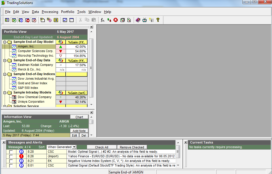 Программа Trading Solutions. Нейронные сети для вашего анализа рынка Нейронные сети - это искусственный интеллект, который способен анализировать полученные результаты и подобно человеку делать работу над ошибками. Способность к самообучению и работе над ошибками делают нейронные сети просто незаменимыми алгоритмами в области автоматизации торговых стратегий. Ведь постоянная рутинная работа вокруг оптимизации множества параметров алгоритма просто отпадает. Программа Trading Solutions – это специальное приложение, благодаря которому вы можете создавать нейронные сети по ряду заложенных критериев и на их основе получать готовые торговые алгоритмы. Trading Solutions предназначена для прогнозирования рынка на основе нейронных сетей, благодаря чему вы сможете получать торговые сигналы на их основе, а также провести историческое тестирование, прежде чем воспользоваться алгоритмом. Стоит заметить, что программа позволяет черпать исторические данные из нескольких источников, что позволяет охватить финансовые активы с всевозможных бирж. Установка Trading Solutions Программа Trading Solutions – это независимое приложение, от любой торговой платформы пользующееся популярностью как среди трейдеров торгующих на рынке форекс, так и на фондовой бирже. Установка Trading Solutions ничем не отличается от установки любой другой программы на ваш персональный компьютер. После скачивания установочного файла его следует запустить, после чего вам потребуется указать путь установки программы, а также согласится с лицензионным соглашением. Поскольку программа на данном этапе не поддерживается разработчиком, для ее функционирования вам понадобится специальный ключ. Ключ программы находится вместе с архивом, а для того чтобы его активировать необходимо сбросить файл в папку, куда вы установили программу и согласится с заменой файлов. Если вы все сделали верно, то после первого запуска вы получите вот такой вид программы: