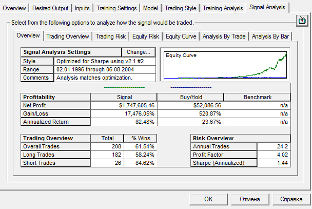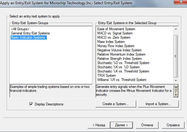Перед вами появится список вариантов, среди которых вы можете проанализировать полученные сигналы, создать оптимальные сигналы, создать звуковое оповещение и многое другое. Для того чтобы создать критерии для создания алгоритма выберите опцию «Apply Rules entry/exit systems». Затем появится окно со списком различных стандартных индикаторов как макд, скользящее средне, стохастик и ряда встроенных стратегий. После того как вы выберите один из вариантов по которому будет создаваться нейронная сеть вы сможете задать необходимые настройки, после чего получите результат созданного вами алгоритма.