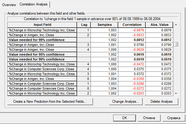 Для того чтобы вычислить корреляцию вызовите дополнительное меню с помощью правой кнопки мыши на выбранном вами активе и среди предложенного списка опций нажмите на «Analyze Correlation». Затем появится окно в котором вы сможете выбрать критерии для поиска корреляции, а именно цены закрытия, средние цены и ряд других параметров. После того как программа проанализирует критерии вы получите таблицу со списком активов а также значением их корреляции.