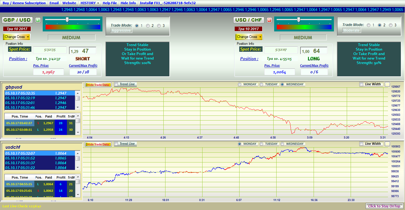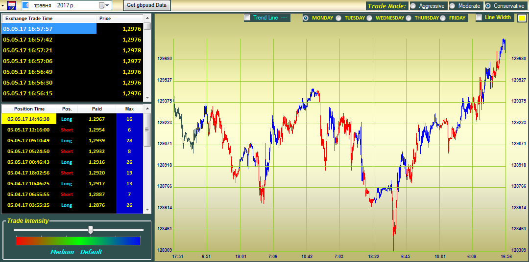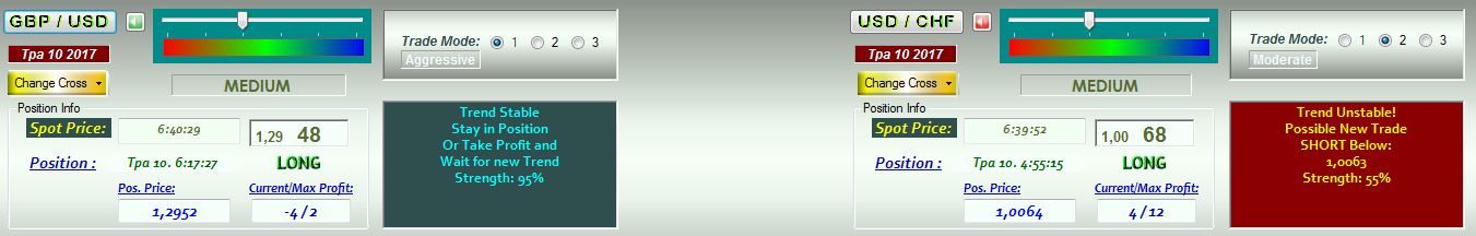После первого запуска программы вы сможете изменить выбранные вами валютные пары. Для этого в левом верхнем углу зайдите в пункт меню «Change Cross» и из появившегося списка символов выберите тот, по которому вы хотели бы получать информацию. В программе присутствует возможность установки рисков. Для этого перетащите ползунок в левом верхнем углу возле названия актива в нужное вам положение. Стоит отметить, чем агрессивней степень риска вы выберете, тем большее количество сигналов вы будете получать. Очень важно понимать, чем агрессивней стратегия и ее сигналы – тем большее количество вы получите убыточных сделок, поэтому следует выбирать золотую средину. В программе внедрено три модуля работы с канальной торговой стратегией, сигналы которой происходят из минутного графика. Для того чтобы переключить торговую стратегию, необходимо в окошке Trade mode выбрать цифру 1,2 или 3 в зависимости какую стратегию вы хотите активировать. При работе с программой необходимо отслеживать окошко, которое находится непосредственно под окном выбора типа торговой стратегии. Внутри окна находятся данные о силе тренда и его направлении, при этом слева вы можете увидеть текущую цену, направление сделки, цену для входа в рынок, а также соотношение прибыли к убытку. Изменение текущего тренда является сигналом для открытия сделки, причем вы будете получать звуковое оповещение при появление подобных событий.
