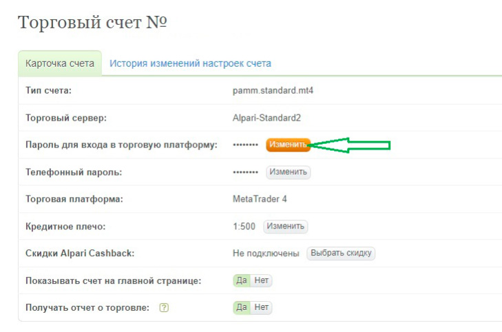 Обычно это номер самого счета, пароль для входа в торговую платформу, пароль с урезанными правами для инвестора и телефонный пароль. Не путать с паролем в кабинет трейдера. Чаще всего все эти данные приходят на электронную почту сразу после открытия счета, обычно пароли состоят из случайного набора цифр и букв, и имеют следующий вид «D5r1K7Ez23pN», запомнить это просто не реально. Поэтому рекомендуется сохранить все полученные данные в надежном месте, желательно на съемном носителе информации. Но все мы знаем, что по-настоящему надежных мест нет, поэтому лучше всего хранить всю важную информацию в своей голове, для этого, сразу по получению данных, следует сменить присланные пароли на тот, что вы не забудете. Это исключит воровство или потерю паролей. Чаще всего встречаются два способа сменить пароль доступа к счету трейдера на свой. В торговом кабинете у брокераДля смены данных по счету требуется перейти в раздел личного кабинета «Торговые счета» или «Мои счета» название зависит от вашего брокера: