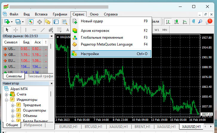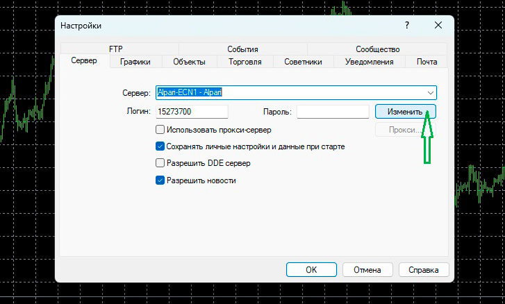 А после кликнуть на том счете, данные которого требуется изменить, в результате вам откроется карточка управления, тут и меняем пароль. К сожалению, такая возможность присутствует далеко не у каждого брокера, в этом случае используем альтернативу. Изменение пароля от счета в metatraderК сожалению, для того, что бы воспользоваться данным вариантом, нужно знать текущий пароль от выбранного счета. Запускаем торговую платформу metatrader и в верхнем меню «Сервис – Настройки» переходим в панель управления настройками: