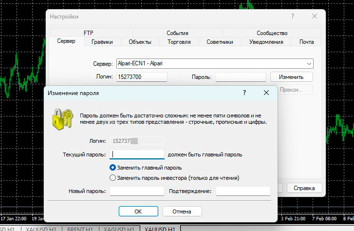 В результате вам откроется окошко, где вы сможете ввести новые пароли трейдера или инвестора, как уже говорилось ранее, для замены требуется знать текущий пароль: