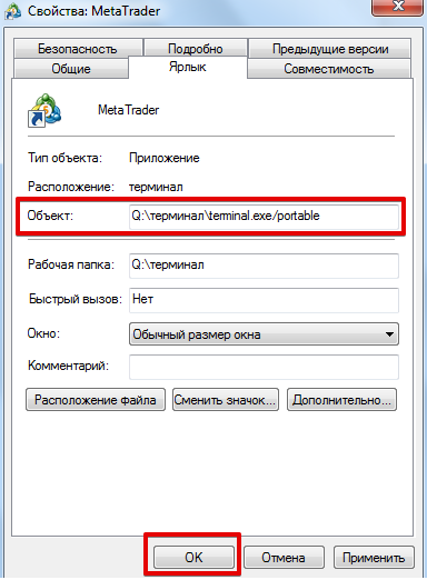 Далее выделите ярлык и правой кнопкой мыши и запустите дополнительное меню, в котором выберите пункт свойства. В появившемся окне обратите внимание на строку «Объект», в которой вам потребуется дописать /portable. Если вы не скорректируете название, программа не запустится с флешки. Более детально смотрим ниже: