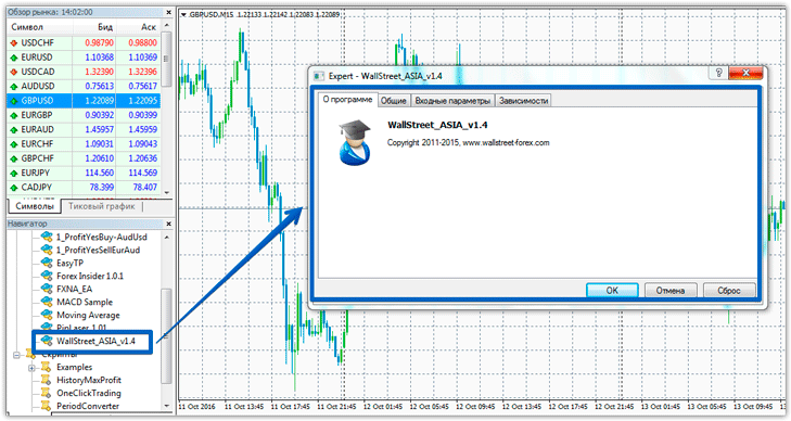 После появления списка системных папок отыщите папку с названием Libraries и сбросьте в нее файлы библиотеки, а также найдите папку под название expert и сбросьте в нее советник Азия. Перезапустив торговый терминал Азия появится в списке советников, а для того чтобы начать торговлю перетащите на пятнадцатиминутный график валютной пары GBPUSD эксперт.