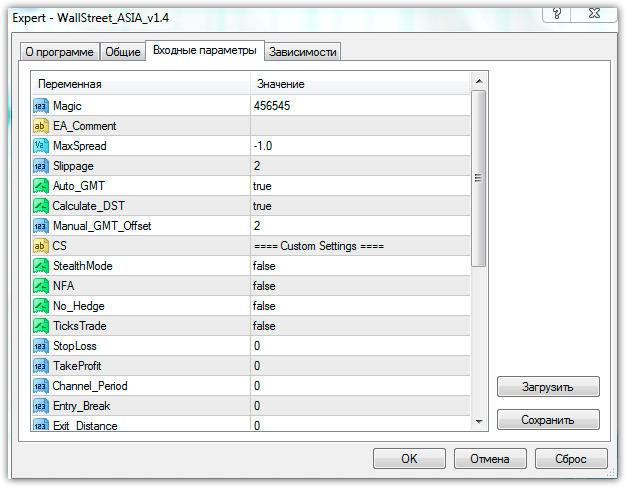 В советнике довольно широкий ряд настроек, поэтому вы сможете легко самостоятельно подстраивать Азию под любую валютную пару. Так, в показателе MaxSpread вы можете ограничить максимальный спред, при котором советник может открыться, а Slippage позволяет ограничить работу эксперта при проскальзывании. Параметр  Auto GMT позволяет определиться часовой пояс вашего брокера, а в строке Manual GMT Offset вы можете самостоятельно задать часовой пояс.