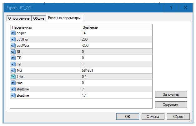 Как мы уже упоминали, советник основан всего на одном стандартном индикаторе. Стратегия эксперта выглядит предельно ясно и просто, а именно торговля ведется на выход из зон перекупленности и перепроданности. Так эксперт будет покупать заданным лотом, если линия CCI упадет до -200, а продавать, в случае если линия вырастет до +200. Поскольку линия CCI может помногу раз входить в эти зоны и выходить с них с малейшим отклонением, робот может открывать по несколько позиций одновременно. По умолчанию в советнике не установлены стоп приказ и профит, поэтому эксперт закрывает позицию при появлении нового сигнала.