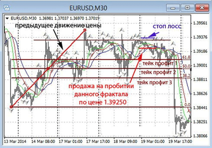 На следующей картинке ниже изображен 2-й способ постановки TakeProfit по числам коррекции Фибо.