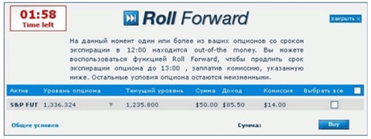 Пролонгирование срока опциона Данный алгоритм торговли бинарными опциона мидиаметрально противоположен предыдущему, так как в первом случае необходимо было завершить сделку раньше времени, а в этом сделку продлить. Сделать это можно с помощью RollForward, платформа которого показана на картинке ниже.