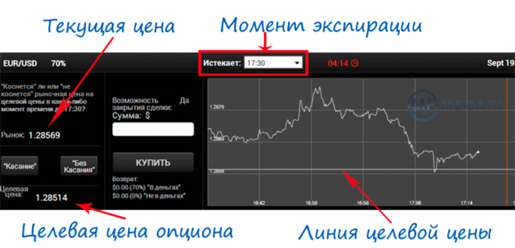 Принципы стратегии Торговля опционами ван-тач должна совершаться в направлении основной ценовой тенденции. При этом нужно ориентироваться на пробитие локальных уровней. От времени исполнения контракта зависит целевое значение – уровень, которого должен достигнуть ценовой график. Для удобства прогнозирования и мониторинга целевая цена отмечается на графике в виде горизонтальной линии.