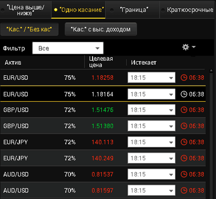 Бинарные опционы one touch нельзя назвать классическими, поскольку их суть сводится не к определению повышения/понижения стоимости актива, а заключается в прогнозировании достижения ценой определенного уровня.
