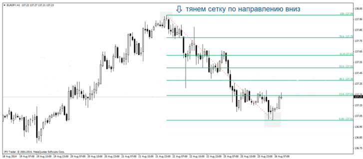 • 0,236 и 0,382 – это первые уровни ценовой коррекции; Установка сетки Фибо Открываем график валютной пары, устанавливаем таймфрейм и выбираем сетку Фибо. Сетка растягивается в сторону движения основной тенденции: • в случае нисходящего тренда сетка растягивается по направлению от точки локального минимума до локального максимума; • при восходящем тренде сетка растягивается от локального максимума до локального минимума.