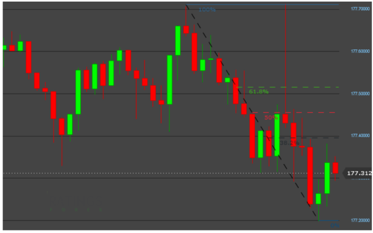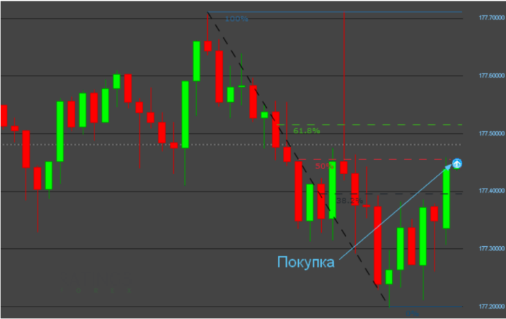 Правила торговли Уровни Фибоначчи – это мощные линии поддержки и сопротивления, поэтому торговля бинарными опционами по Фибоначчи может совершаться в двух вариантах: на пробой уровней или на отбой от них. При этом следует учитывать, что сигнал рассматривается, как достоверный, только после окончания формирования свечи за определенным уровнем Фибо. Если же свеча пробила уровень Фибоначчи только своей тенью, то такой сигнал является ложным и в расчет не берется. • Определяем точку входа. Итак, если ценовой график пробивает уровни 0,382, 0,5 и 0,618, то в ближайшее время цена продолжит свое движение, если цена отскакивает от этих уровней, то формируется обратная тенденция с вероятным движением до следующего уровня. • Покупаем опцион. При выборе опциона нужно руководствоваться правилом: если цена пробивает уровень поддержки, покупаем Put; если цена пробивает уровень сопротивления, то покупаем Call. Срок экспирации выбирают продолжительностью двух свечей. Рассмотрим пример использования уровней Фибоначчи в бинарных опционах. На рисунке ниже показан график пары GBP/JPY.
