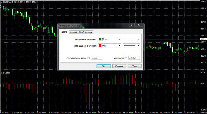Перед изменением цены на графике в реальности происходит изменение направление силы, которое движет рынок в данный момент. А еще ранее в этой цепочке перед изменением направлением силы является ускорение данной силы или замедление. По сути, индикатор показывает базовую точку, от которой отталкивается все последующее изменение цены. Все работы, которые созданы легендарным Билом Вильямсом, занесены торговые платформы Meta Trader 4 и Meta Trader 5 по умолчанию. Для того что бы нанести индикатор на график с ценой войдите в меню индикаторы, откройте вкладку Билла Вильямса и перетащите Accelerator/Decelerator Oscillator на график с ценой. Перед вами появится окно настроек, в котором вы можете улучшить визуальное восприятие индикатора путем утолщения линий и смены цвета. Период индикатора вам изменить не удастся.
