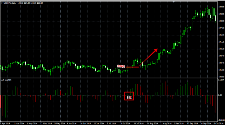 Индикатор появится в первом дополнительном окне в виде гистограммы зеленого и красного цвета с сигнальной нулевой линией посредине. Для тех кто не впервые сталкивается с работами Билла Вильямса, думаю не стало сюрпризом что инструмент как две капли воды похож на Аwesome Оscillator. Действительно даже при анализе расчетной формулы, что индикатор вычисляется путем отнимания от значения Аwesome Оscillator скользящего среднего. Философия при использовании этого инструмента очень проста. Перед каждым разворотом происходит замедление движущей силы, а вскоре начало либо нового движения или движение с новой силой в направлении тренда. В отличии от АО при работе с инструментом не учитывается пробой сигнальной линии. Период ускорения, роста индикатор отображает в виде зеленого бара, а период замедления, снижения в виде красного бара. Автор индикатора утверждает, что Accelerator/Decelerator Oscillator эффективно приносит прибыль только на дневном графике, ну и теоретически возможно на четырехчасовом. Однако это не мешает трейдерам применять его на меньших тайм фреймах в своих торговых стратегиях. Индикатор в первую очередь предназначен для фильтра позиции, однако наши трейдеры наловчились его применять и в качестве сигнального. Например, разрешается покупать только когда бар зеленого цвета и находится над сигнальной линией. На продажи можно входить когда бар индикатора красного цвета, а сам он находится под сигнальной линией. Если рассматривать индикатор Decelerator Oscillator в качестве сигнального, то разрешается входить в позицию на покупку при появлении двух подряд зеленых столбиков и это при том, что они должны находится над сигнальной линией. На продажу сигнал появляется, если появилось два красных столбика в подряд ниже сигнальной линии. Пример входа в позицию смотрим на картинке ниже: