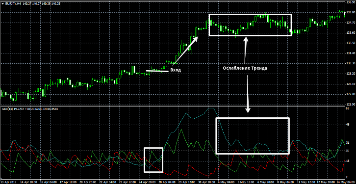 Описание и настройка рабочих параметров индикатора adx.На графике цены видно, что индикатор находится в первом дополнительном окне и состоит из трех линий. Первая линия, которая голубого цвета является линией самого индикатора ADX. Синяя линия это линия DI+, а красная это DI-. Сама линия ADX не показывает нам тип тренда, а лишь показывает его силу. Когда синяя линия индикатора направлена вверх, это означает что тренд сильный, а если начала опускаться вниз, то тренд ослабевает. Хочу еще раз подчеркнуть, что линия голубая линия показывает силу тренда, поэтому если цена будет падать стремительно вниз, то линия индикатора начнет расти вверх. За определение направления тренда в скрипте служат линии DI+ и DI- (зеленая и красная линия). Тренд считается бычьим, если линия DI+ (зеленая) находится над линией DI-(красная). Если линия DI-(красная) находится над DI+ (зеленая) то на рынке преобладают медведи, а это значит что он медвежий. Как вы можете увидеть индикатор adx имеет шкалу. Если линия индикатора ADX находится в зоне от 0 до 20, то это значит, что тренд слаб и скорее всего это боковое движение. Если линия находится выше уровня 40, это говорит нам о том, что тренд сильный. Если линия пересекает уровень 20 снизу вверх, это информирует нас о том, что начинается новое движение. Если линия индикатора падает с уровня 60 и выше и пробивает уровень 40 это говорит о том, что тренд начал искать, поэтому на данном участке начнется флет. С помощью линий DI+ и DI- можно найти точку входа в рынок, а голубая линия ADX послужит в роли фильтра силы тренда. Например, входим в позицию на покупку, если зеленая линия пересекла снизу вверх, а голубая линия индикатора направляется вверх. Готовая стратегия на АДХ - http://forexluck.ru/strateg-video/st-adx-vid В позицию на продажу входим если красная линия пересекла зеленую снизу вверх, а голубая линия так же направлена вниз. Пример входа в позицию смотрим на картинке ниже: