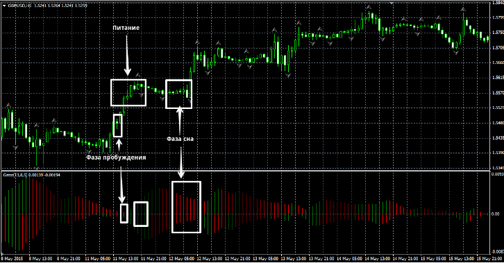 В своей книге автор лирично проводит аналогию между поведением индикатора Gator Oscillator и настоящим живым Аллигатором. Билл Вильям четко выделяет четыре стадии, в которых может пребывать индикатор. Первая стадия это сон аллигатора. Сном в понимании автора является флет, консолидация. Gator oscillator показывает сон (флет) если оба столбика гистограммы (как снизу, так и сверху) окрашены в красный цвет. Второй фазой является пробуждение Аллигатора. Под пробуждением автор подразумевает начала движение цены в определенную сторону. Считается, что аллигатор начал просыпаться, когда одна гистограмма окрасилась в красный цвет, а вторая в зеленый. Причем неважно сверху или снизу будет красная или зеленная гистограмма, важно, что бы их цвет был разным. Третей фазой является питание аллигатора, или же момент когда аллигатор пожирает цену. Под такими крылатыми фразами скрывается, смыл того что цена взяла четкое направление и сформировался определенный тренд. Индикатор представляет нам тренд сменной гистограммы в обеих плоскостях на зеленый цвет. Причем очень важно отметить, что величина гистограммы отображает силу тренда. Четвертая фаза называется фазой насыщения. Считается, когда аллигатор пообедал, приходит период насыщения. Простыми словами тренд начинает угасать. Инструмент показывает данную фазу, если после чисто зеленной гистограммы появляется красный столбик гистограммы. Более детально вы можете отследить все фазы на картинке ниже: